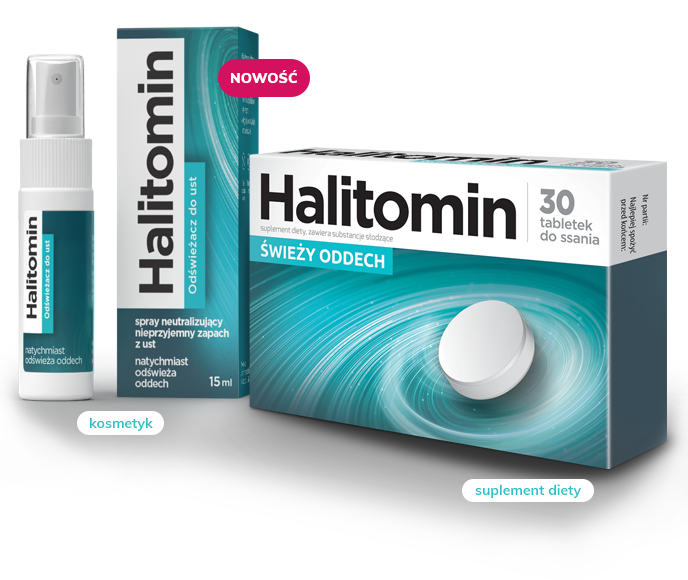 Halitomin to linia produktów dla osób, które chcą mieć świeży oddech: tabletki do ssania (suplement diety)¹ oraz odświeżacz do ust w sprayu (kosmetyk).